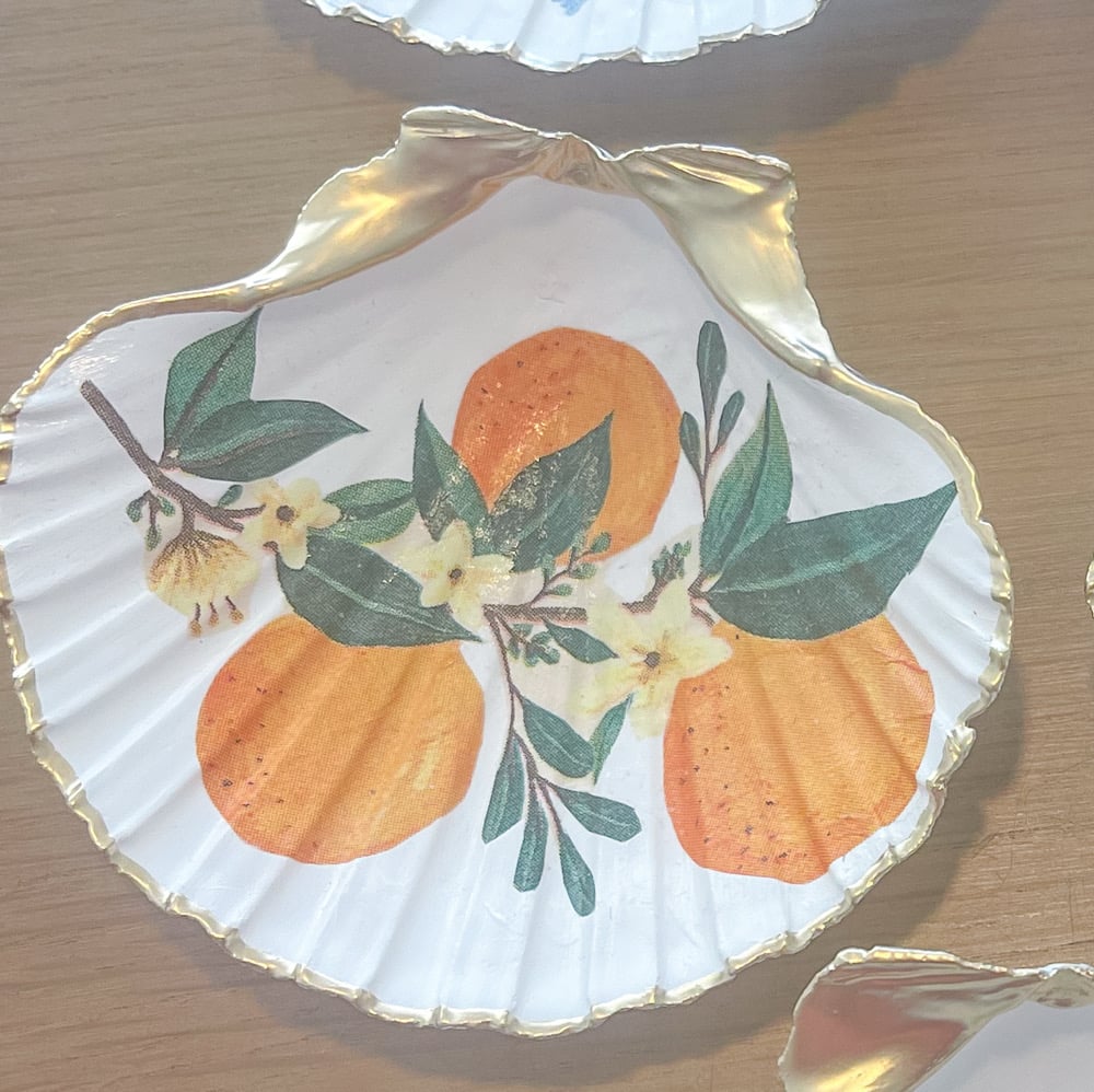 Each piece begins as a real shell and is decoupaged, hand-painted, and sealed with a low-VOC resin, giving it a sun-kissed sheen.