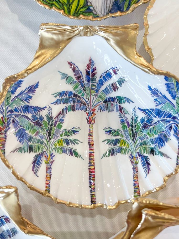 Each piece begins as a real shell and is decoupaged, hand-painted, and sealed with a low-VOC resin, giving it a sun-kissed sheen.